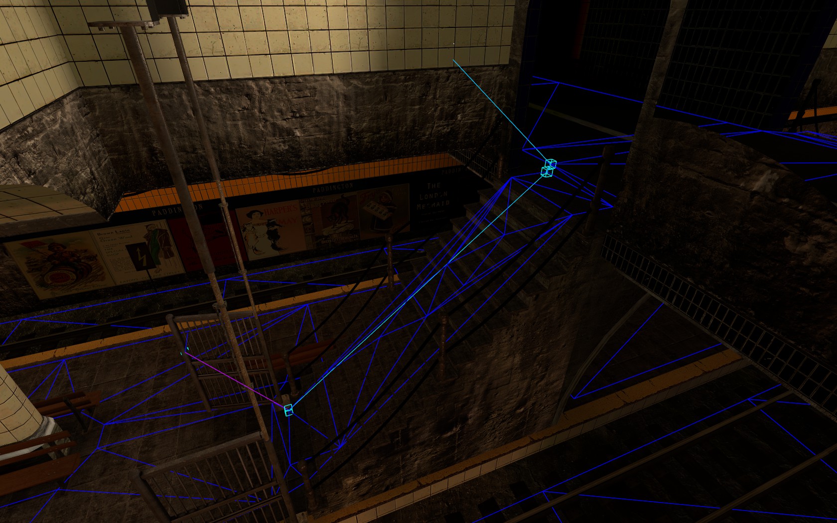Navmesh and pathfinding debug visualization (it's an older screenshot I found and the navmesh does not seem to include static prop collision meshes like in the pictures above)