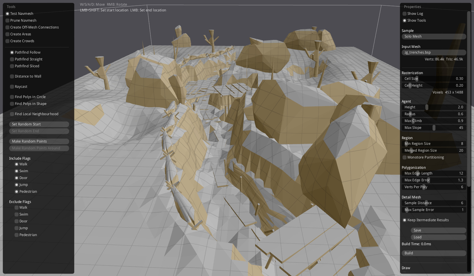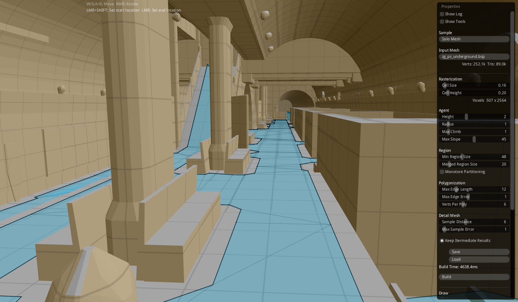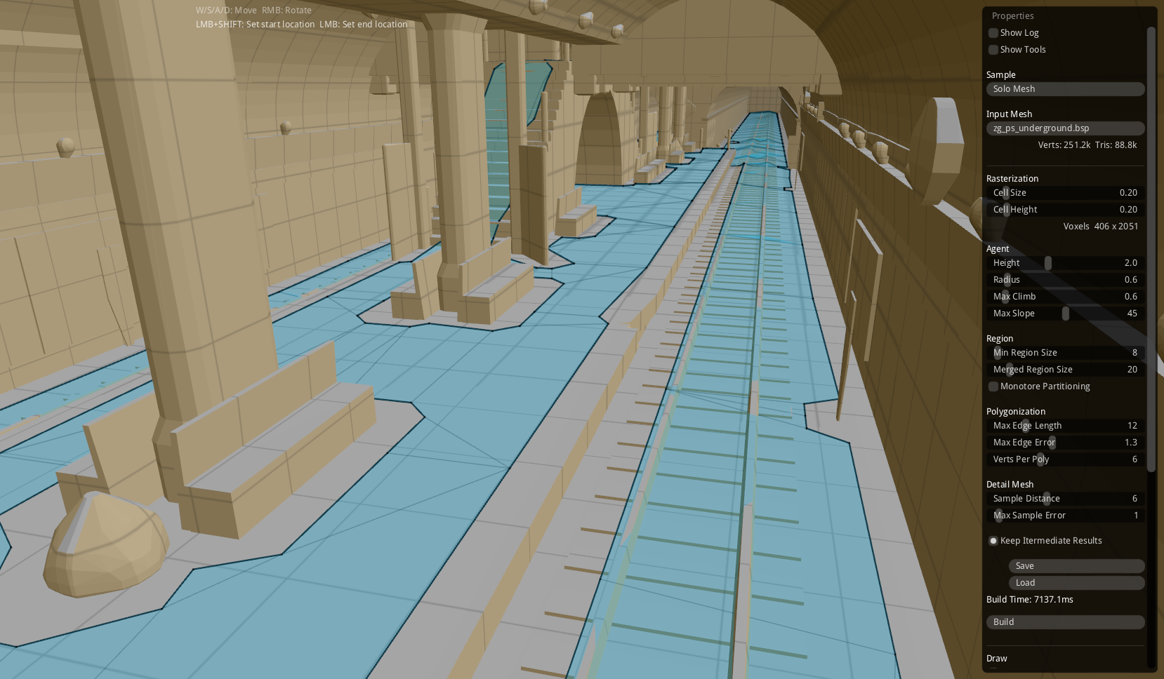 Navmesh and pathfinding debug visualization (it's an older screenshot I found and the navmesh does not seem to include static prop collision meshes like in the pictures above)